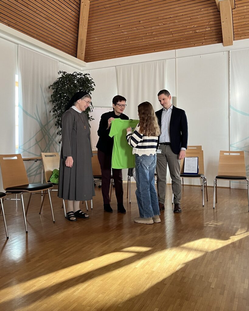 Zum Abschied bekam die 1b Klasse funktionelle T-Shirts geschenkt, damit auch nach außen hin sofort ersichtlich ist, mit wem die Kinder in Patenschaft stehen. Darüber hinaus wurden die jungen Besucherinnen und Besucher mit einem köstlichen Mittagessen verwöhnt.