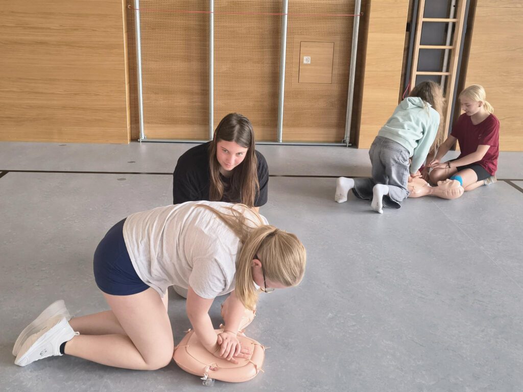 Seit 6 Jahren führen wir die Aktion „Schüler retten Leben“ durch. Dabei üben unseren Kinder einmal jährlich die korrekte Durchführung der Herzdruckmassage. Dazu stehen uns auch 10 Reanimationspuppen zur Verfügung, die ein optimales Üben gewährleisten.