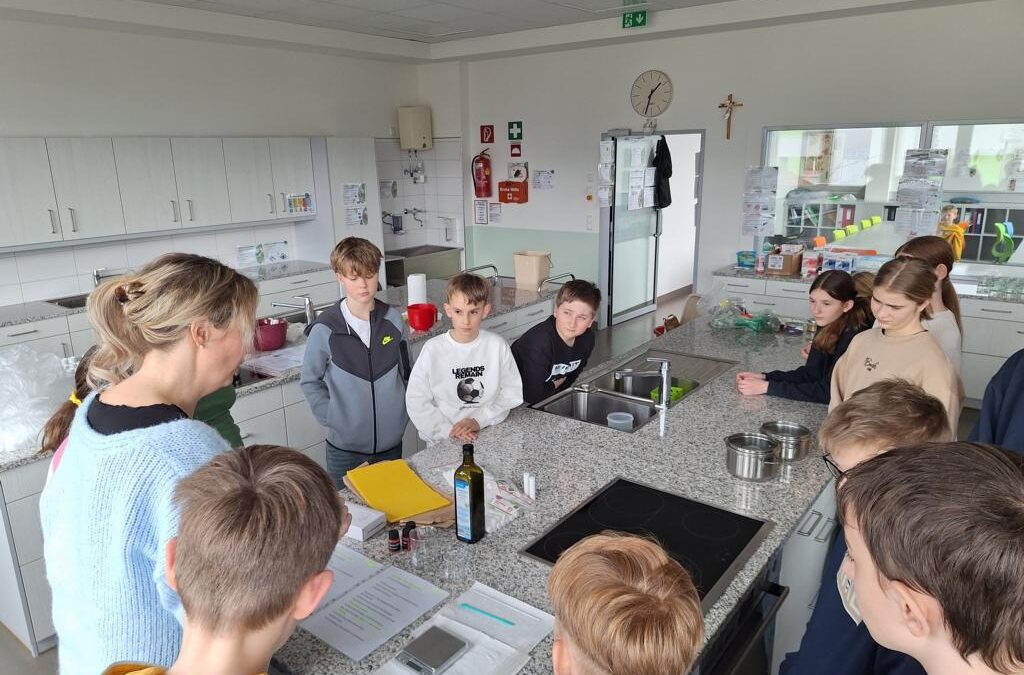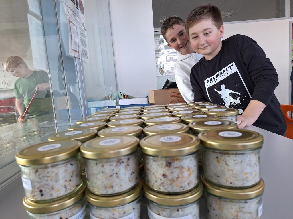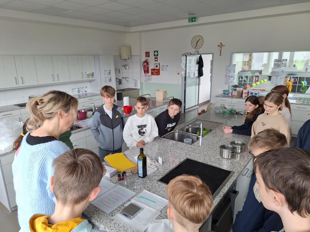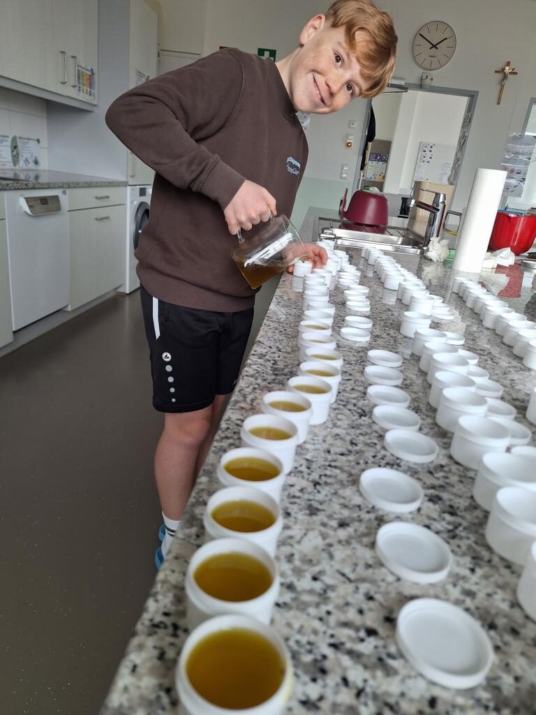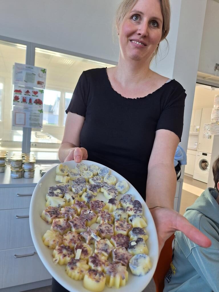 Am Mittwoch, 25.02. war es soweit. Die 3a produziert an ihrem freien Nachmittag – mit fachkundiger Unterstützung von Fr. Reiter – in der Lehrküche die erforderlichen Mengen. Fr. Reiter war sehr zufrieden mit ihren Schützlingen und diese freuten sich, dass die Arbeit gut von der Hand ging. Die Geschäftsführung bedankte sich abschließend mit einem Blumenstrauß bei der Workshopleiterin, die für ihre Arbeit keine Kosten verrechnete.